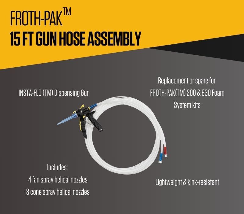 The Froth-Pak™ 15-foot Gun Hose Assembly is ideal for contractors and builders looking to replace lost, damaged, or worn-out hoses for their Froth-Pak™ Foam Systems. It is also recommended for upgrading to a longer assembly, providing better reach and minimizing the need to reposition heavy tanks during insulation projects. Built to last, the 15-foot Gun Hose Assembly comes with a robust hose that won’t coil when stretched, and helical nozzles to ensure optimal foam quality and reduce cleanup. Compatible with Froth-Pak™ 200 and 630 Spray Foam Systems used for all of your residential construction or remodeling projects, including attics, basements, rim joists, wall cavities, and around pipes or ducts. Maintain your peace of mind, and keep a spare on hand to avoid project delays.
