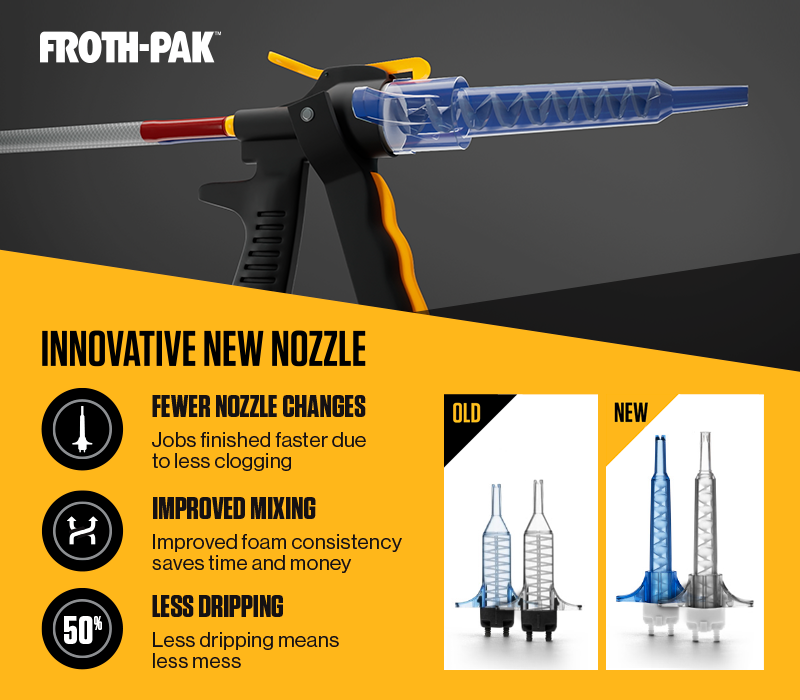 The Cone Spray nozzle delivers a focused, more precise spray perfect for applications such as perimeter air sealing. Don’t run out while you’re spraying with the 25 pack of FROTH-PAK™ Cone Spray nozzles. The updated nozzle design delivers a more consistent quality foam with fewer nozzle changes allowing you to work faster and save time and money.